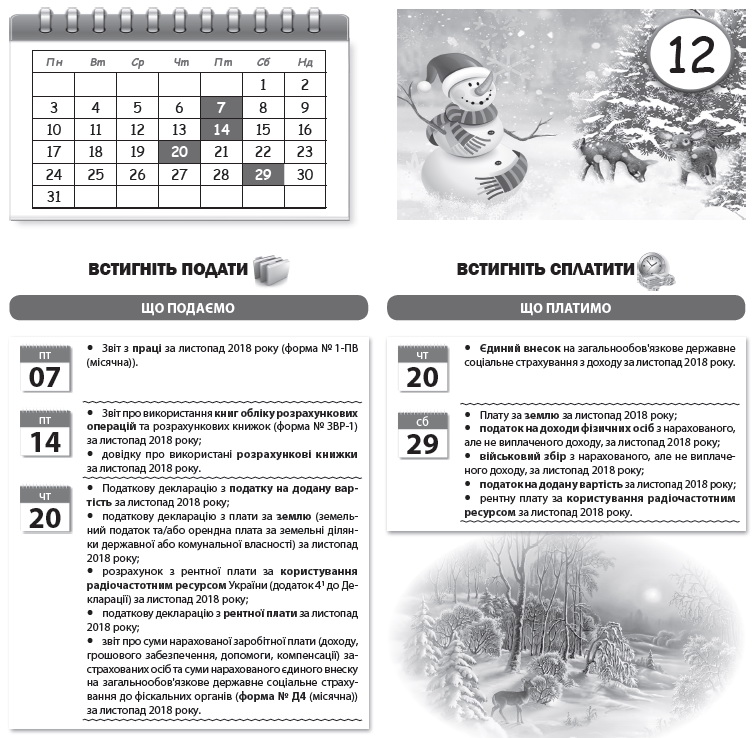 ДО ВІДОМА. Нацбанк переносить роботу системи електронних платежів із 31.12.2018 р. на 29.12.2018 р. (рішення Правління НБУ від 13.02.2018 р.№ 89-рш). Проте краще не відкладати сплату податків на останній день. Тим більше, що органи Казначейства, як правило, в останній день роботи платежі не проводять. Точний графік роботи органів Казначейства розміщують на офіційному сайті напередодні святкових днів. Але в будь-якому разі радимо не затягувати зі сплатою податків і зборів до останнього дня, а погасити всі зобов’язання завчасно.