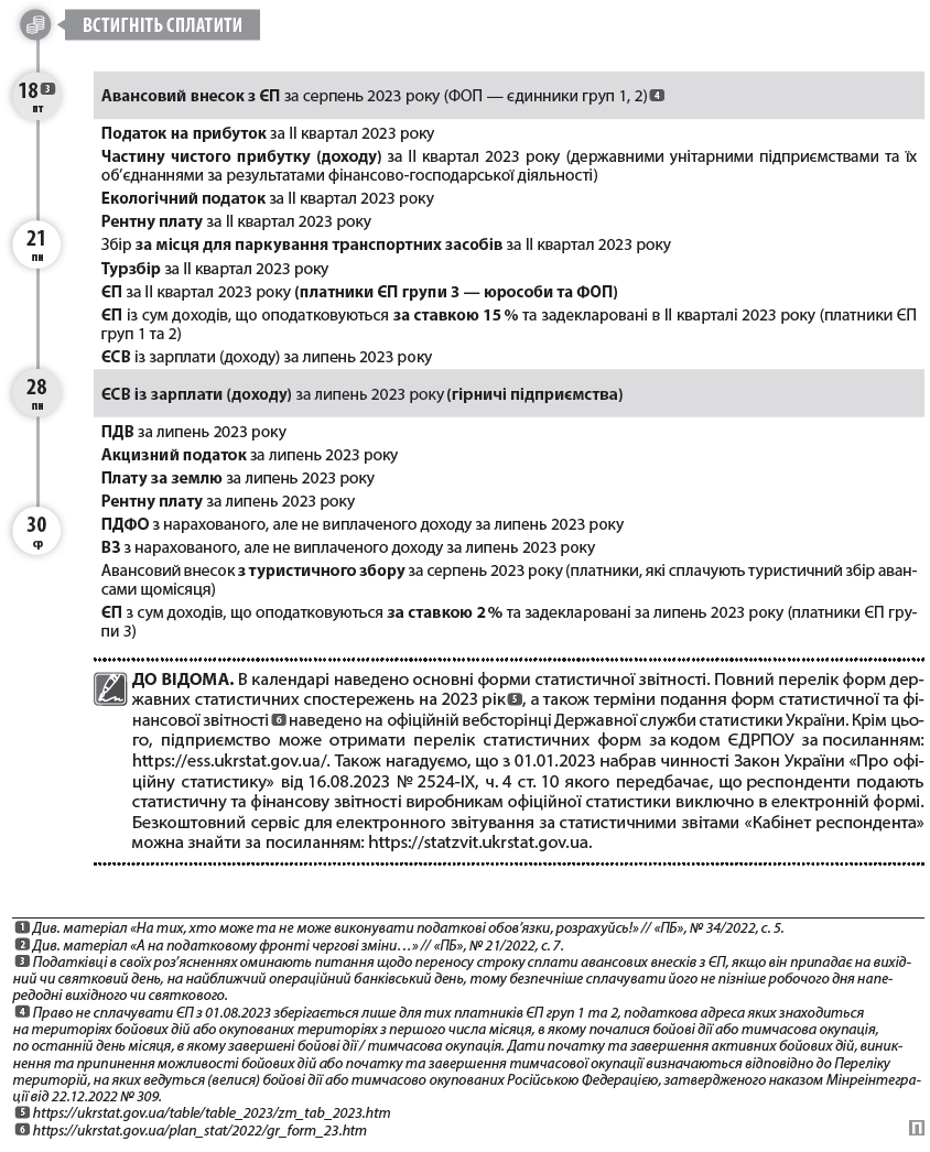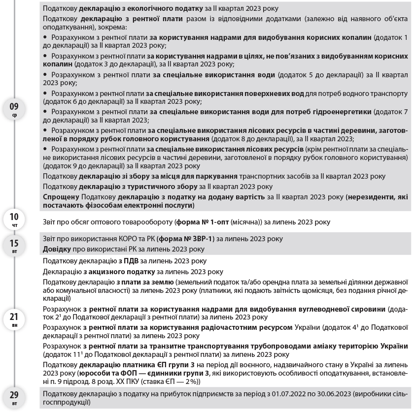 04 пт  07 пн  09 ср  Календар бухгалтера та ФОП на серпень 2023 року  ВАЖЛИВО! Відповідно до п.п. 69.1 підрозд. 10 розд. ХХ ПКУ в разі відсутності у платника податків можливості  1  своєчасно виконати свій податковий обов’язок щодо дотримання термінів сплати податків та зборів, подання звітності, в тому числі звітності, передбаченої п. 46.2 ПКУ, платники податків звільняються від передбаченої ПКУ відповідальності з обов’язковим виконанням таких обов’язків протягом шести місяців після припинення або скасування воєнного стану або протягом 60 к. дн. з першого дня місяця, наступного за місяцем відновлення таких можливостей платника податків  2  .  Водночас згідно із Законом України «Про захист інтересів суб’єктів подання звітності та інших документів у період дії воєнного стану або стану війни» від 03.03.2022 № 2115-ІХ в період дії правового режиму воєнного стану до платників податків не застосовується відповідальність за неподання або несвоєчасне подання «неподаткової» звітності, зокрема до органів статистики, за умови, що така звітність буде подана протягом трьох місяців після припинення або скасування воєнного стану в Україні.  Зауважимо, що Законом України «Про внесення змін до Податкового кодексу України та інших законів України щодо особливостей оподаткування у період дії воєнного стану» від 30.06.2023 № 3219-ІХ передбачено відновлення з 01.08.2023 нарахування штрафів, визначених ч. 11 ст. 25 Закону про ЄСВ, зокрема, за неподання, несвоєчасне подання, подання не за встановленою формою звітності про нарахування ЄСВ, а також відновлення нарахування пені, визначеної ч. 10 ст. 25 Закону про ЄСВ, на суму недоїмки.  Звіт про товарооборот торгової мережі (форма № 1-торг (місячна)) за липень 2023 року  Звіт з праці 2023 року (форма № 1-ПВ (місячна)) за липень  Звіт про заборгованість з оплати праці (форма № 3-борг (місячна)) за липень 2023 року  Звіт про обсяги виробництва та реалізації спирту (форма № 1-РС) за липень 2023 року  Звіт про обсяги виробництва та реалізації алкогольних напоїв (форма № 2-РС) за липень 2023 року  Звіт про обсяги виробництва та реалізації тютюнових виробів (форма № 3-РС) за липень 2023 року  Звіт про обсяги придбання та реалізації алкогольних напоїв у оптовій мережі (форма № 1-ОА) за липень 2023 року  Звіт про обсяги придбання та реалізації тютюнових виробів у оптовій мережі (форма № 1-ОТ) за липень 2023 року  Податкову декларацію з податку на прибуток підприємств за півріччя 2023 року (платники, у яких податковий період дорівнює календарному кварталу)  Розрахунок частини чистого прибутку (доходу), дивідендів на державну частку за півріччя 2023 року  Фінзвітність до органів ДПС за півріччя 2023 року (платники податку на прибуток, які звітують щокварталу)  Податковий розрахунок сум доходу, нарахованого (сплаченого) на користь платників податків — фізичних осіб, і сум утриманого з них податку, а також сум нарахованого єдиного внеску за ІІ квартал 2023 року  Податкову декларацію платника ЄП — юрособи групи 3 за ІІ квартал 2023 року  Податкову декларацію платника ЄП — ФОП за ІІ квартал 2023 року (ФОП — єдинники групи 3)  Податкову декларацію платника ЄП — ФОП за ІІ квартал 2023 року в разі перевищення протягом року граничного обсягу доходу, самостійного прийняття рішення про перехід на сплату податку за ставками, встановленими для платників ЄП «старшої» групи, або про перехід на загал