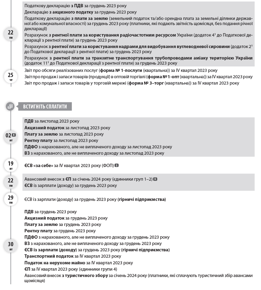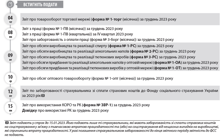 ДО ВІДОМА. В календарі наведено основні форми статистичної звітності. Повний перелік форм державних статистичних спостережень на 2023 рік, а також терміни подання форм статистичної та фінансової звітності наведено на офіційній вебсторінці Державної служби статистики України. Крім цього, підприємство може отримати перелік статистичних форм за кодом ЄДРПОУ за посиланням: https://ess.ukrstat.gov.ua/. Також нагадуємо, що з 01.01.2023 набрав чинності Закон України «Про офіційну статистику» від 16.08.2023 № 2524-IX, ч. 4 ст. 10 якого передбачає, що респонденти подають статистичну звітність та фінансову звітність виробникам офіційної статистики виключно в електронній формі. Безкоштовний сервіс для електронного звітування за статистичними звітами «Кабінет респондента» можна знайти за посиланням: https://statzvit.ukrstat.gov.ua.