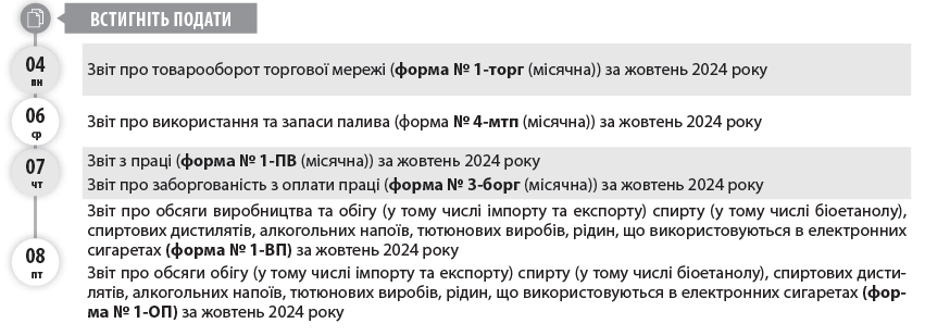 ДО ВІДОМА. У календарі наведено основні форми статистичної звітності. Повний перелік форм державних статистичних спостережень на 2024 рік, а також терміни подання форм статистичної та фінансової звітності наведені на офіційній вебсторінці Державної служби статистики України.