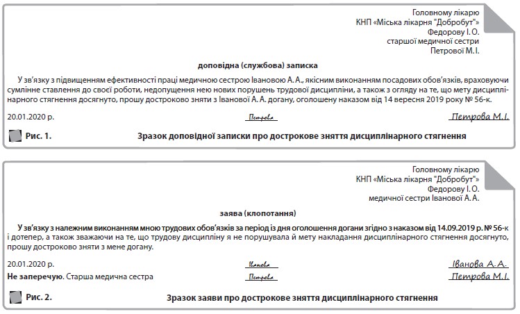 - доповідна, службова записка, подання начальника відділу, старшої медичної сестри (стосовно молодшої медичної сестри), головного бухгалтера (стосовно підлеглого бухгалтера) тощо;