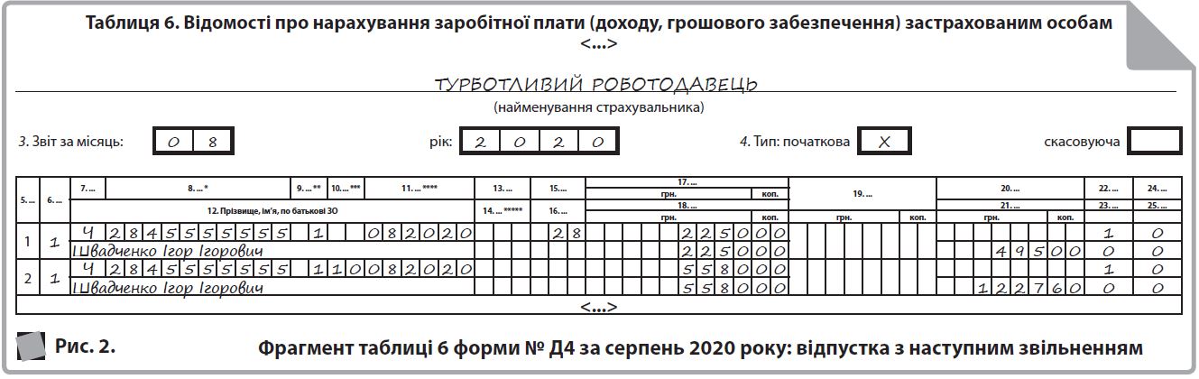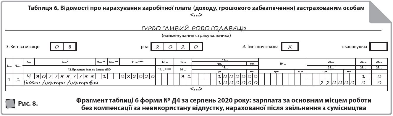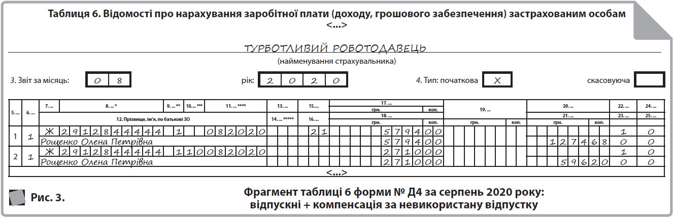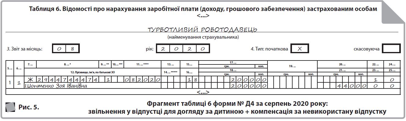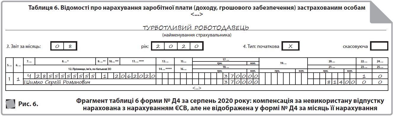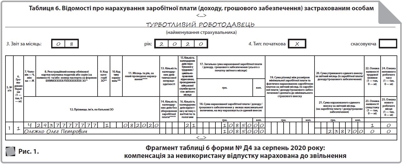 Якщо у працівниці залишилися невикористані дні відпустки, то нарахована в місяці звільнення компенсація відображається в таблицях 1 і 6 форми № Д4 за тими ж правилами, що і зарплата (див. рис. 5). Майте на увазі, що необхідність у виконанні вимоги про сплату ЄСВ з МЗП виникає у тому випадку, якщо це місце роботи основне, працівниця без інвалідності і працівниця перебувала у трудових відносинах увесь місяць (у тому числі, якщо вона звільняється в останній робочий день за графіком роботи). Якщо працівниця звільняється до спливання місяця, то виконувати згадану вимогу не треба.