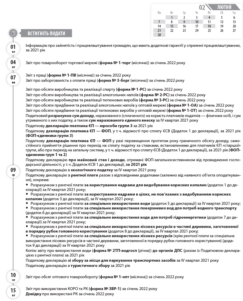 Інформацію про зайнятість і працевлаштування громадян, що мають додаткові гарантії у сприянні працевлаштуванню, за 2021 рік  Звіт про товарооборот торгової мережі (форма № 1-торг (місячна)) за січень 2022 року  Звіт з праці (форма № 1-ПВ (місячна)) за січень 2022 року  Звіт про заборгованість з оплати праці (форма № 3-борг (місячна)) за січень 2022 року  Звіт про обсяги виробництва та реалізації спирту (форма № 1-РС) за січень 2022 року  Звіт про обсяги виробництва та реалізації алкогольних напоїв (форма № 2-РС) за січень 2022 року  Звіт про обсяги виробництва та реалізації тютюнових виробів (форма № 3-РС) за січень 2022 року  Звіт про обсяги придбання та реалізації алкогольних напоїв у оптовій мережі (форма № 1-ОА) за січень 2022 року  Звіт про обсяги придбання та реалізації тютюнових виробів у оптовій мережі (форма № 1-ОТ) за січень 2022 року  Податковий розрахунок сум доходу, нарахованого (сплаченого) на користь платників податків — фізичних осіб, і сум утриманого з них податку, а також сум нарахованого єдиного внеску за ІV квартал 2021 року  Податкову декларацію платника ЄП — юрособи групи 3 за 2021 рік  Податкову декларацію платника ЄП — ФОП, у т. ч. відомості про сплату ЄСВ (Додаток 1 до декларації), за 2021 рік (ФОП-єдинники групи 3)  Податкову декларацію платника ЄП — ФОП у разі перевищення протягом року граничного обсягу доходу, самостійного прийняття рішення про перехід на сплату податку за ставками, встановленими для платників ЄП «старшої» групи, або про перехід на загальну систему, у т. ч. відомості про сплату ЄСВ (Додаток 1 до декларації), за 2021 рік (ФОП-єдинники груп 1 та 2)  Податкову декларацію про майновий стан і доходи, отримані ФОП-загальносистемником від провадження господарської діяльності, у т. ч. Додаток ЄСВ 1 до декларації, за 2021 рік  Податкову декларацію з екологічного податку за IV квартал 2021 року  Податкову декларацію з рентної плати разом з відповідними додатками (залежно від наявного об’єкта оподаткування), зокрема:      Розрахунком з рентної плати за користування надрами для видобування корисних копалин (додаток 1 до декларації) за IV квартал 2021 року;     Розрахунком з рентної плати за користування надрами в цілях, не пов’язаних з видобуванням корисних копалин (додаток 3 до декларації), за IV квартал 2021 року;     Розрахунком з рентної плати за спеціальне використання води (додаток 5 до декларації) за IV квартал 2021 року;     Розрахунком з рентної плати за спеціальне використання поверхневих вод для потреб водного транспорту (додаток 6 до декларації) за IV квартал 2021 року;     Розрахунком з рентної плати за спеціальне використання води для потреб гідроенергетики (додаток 7 до декларації) за IV квартал 2021 року;     Розрахунком з рентної плати за спеціальне використання лісових ресурсів в частині деревини, заготовленої в порядку рубок головного користування (додаток 8 до декларації), за IV квартал 2021 року;     Розрахунком з рентної плати за спеціальне використання лісових ресурсів (крім рентної плати за спеціальне використання лісових ресурсів в частині деревини, заготовленої в порядку рубок головного користування) (додаток 9 до декларації) за IV квартал 2021 року  Копію звіту про використання води (форма № 2ТП-водгосп (річна)) до органів ДПС (разом із Податковою декларацією з рентної плати) за 2021 рік  Податкову декларацію зі збору за місця для паркування транспортних засобі