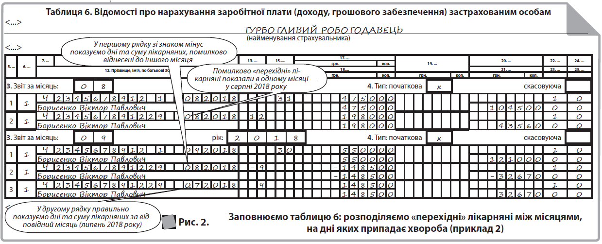 другий — на лікарняні за дні хвороби у липні зі знаком мінус, які помилково показали у полі за серпень (−1485,00 грн). Тут же показуємо зі знаком мінус і кількість днів хвороби за липень у реквізиті 13 (−9). У реквізиті 11 «08.2018»;