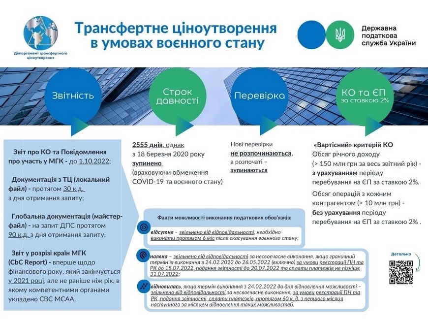 Фахівці ДПС України для забезпечення виконання норм Податкового кодексу України з урахуванням змін, внесених у зв’язку з запровадженням воєнного стану в Україні та одночасної дії особливостей оподаткування, які були запроваджені на період здійснення заходів, спрямованих на запобігання виникненню і поширенню коронавірусної хвороби (COVID-19), для забезпечення взаємодії між платниками податків та ДПС інформують про права та обов’язки платників податків та контролюючих органів з питань контролю за трансфертним ціноутворенням (далі – ТЦ).