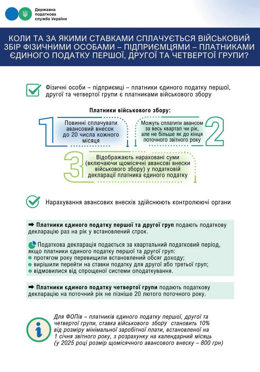 Для ФОПів – платників єдиного податку першої, другої та четвертої групи, ставка військового збору становить 10% від розміру мінімальної заробітної плати, встановленої на 1 січня звітного року, з розрахунку на календарний місяць (у 2025 році розмір щомісячного авансового внеску – 800 грн).