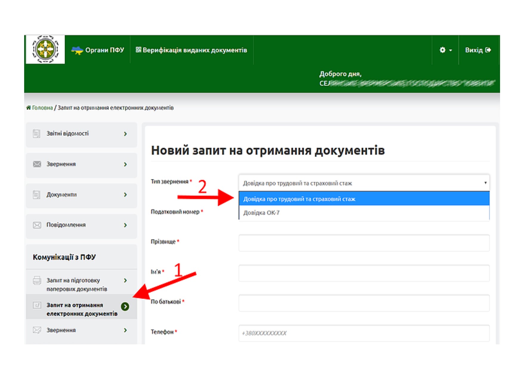Далі вибрати “Запити на отримання електронних документів” та в меню обрати “Довідка про трудовий та страховий стаж”: