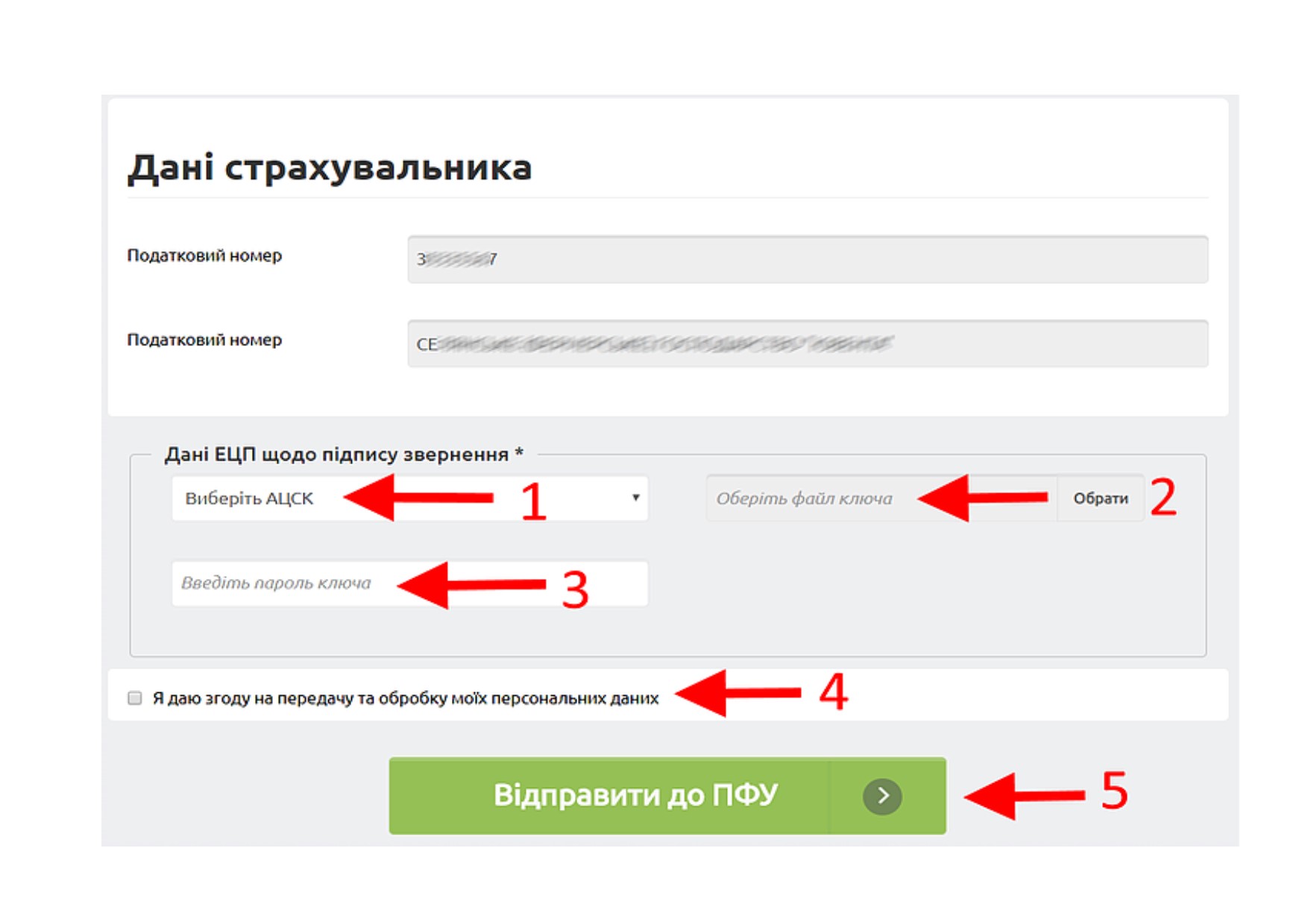 Далі підписати дані страхувальника та Відправити в ПФУ запит: