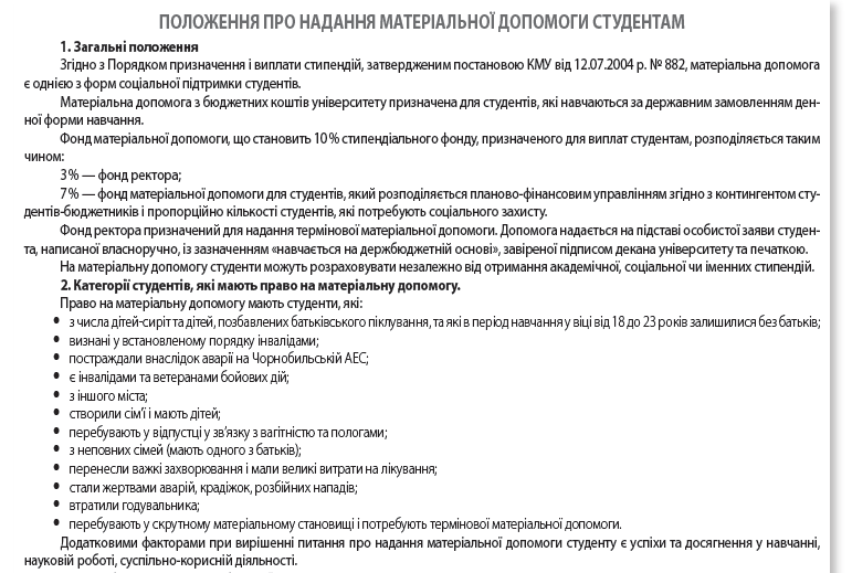 Основание для выплаты Учебное заведение может использовать 10 % средств, предусмотренных на выплату стипендий, на выплату матпомощи учащимся, студентам, курсантам, клиническим ординаторам и аспирантам, которые обучаются по государственному заказу (п. 7 Порядка № 882). Такую помощь выплачивают студентам для повышения жизненного уровня и поощрения за успехи в учебе, участие в общественной, спортивной и научной деятельности.