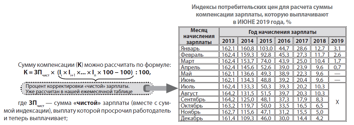 4) если в месяце выплаты задолженности индекс потребительских цен (далее — ИПЦ) нарастающим итогом превысил 100 %, работодатель должен начислить компенсацию. Если ИПЦ менее 100 %, компенсацию не начисляют, а выплачивают только задолженность;