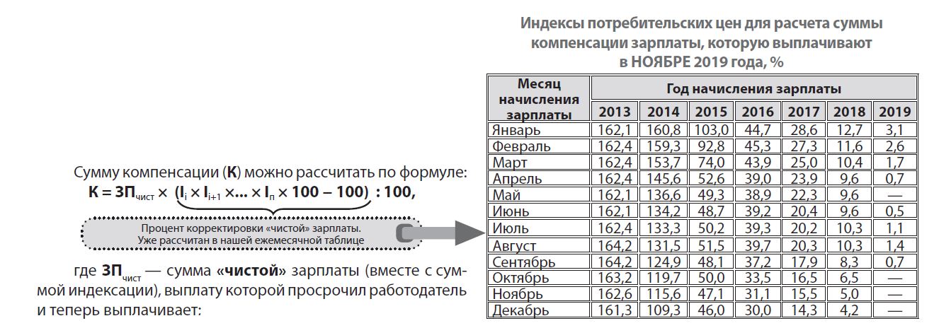 4) если в месяце выплаты задолженности индекс потребительских цен (далее — ИПЦ) нарастающим итогом превысил 100 %, работодатель должен начислить компенсацию. Если ИПЦ менее 100 %, компенсацию не начисляют, а выплачивают только задолженность;