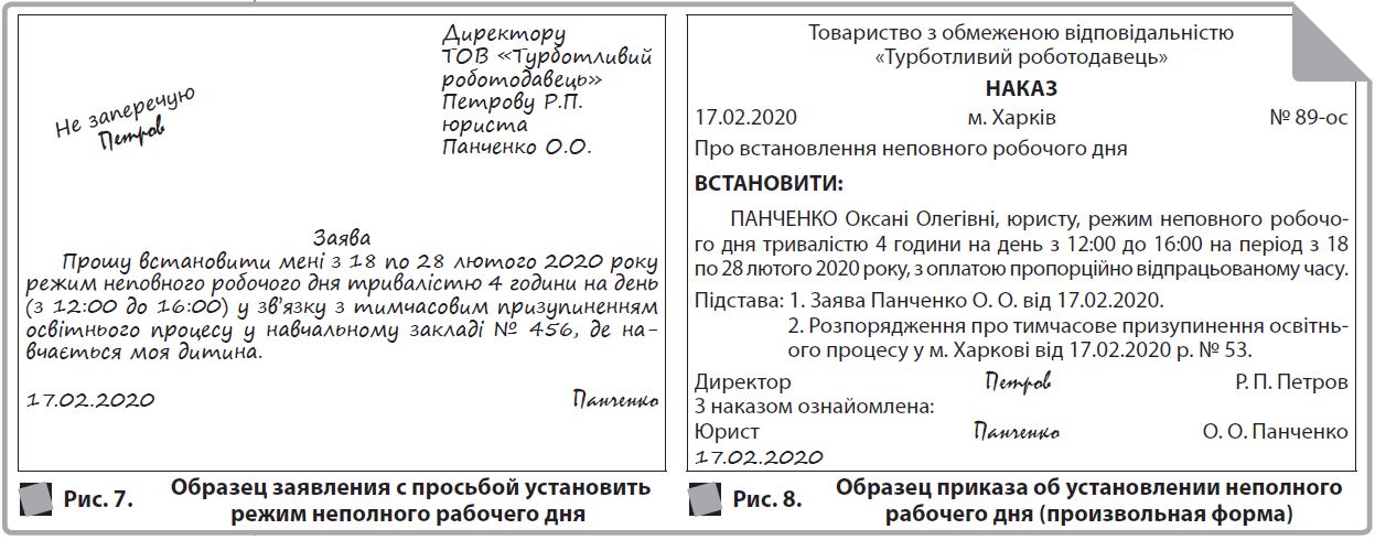 Чтобы отсутствие работника не отразилось на производственной деятельности, работника можно временно перевести на неполное рабочее время на основании ст. 56 КЗоТ. Инициатива в данном случае исходит от работника. Он пишет заявление с указанием причины перевода. В заявлении работник предлагает варианты режима неполного рабочего времени. Он может работать неполный рабочий день или неполную рабочую неделю или скомпоновать эти варианты. Работодатель оформляет перевод приказом. А потом издает приказ о восстановлении прежней продолжительности рабочего времени.