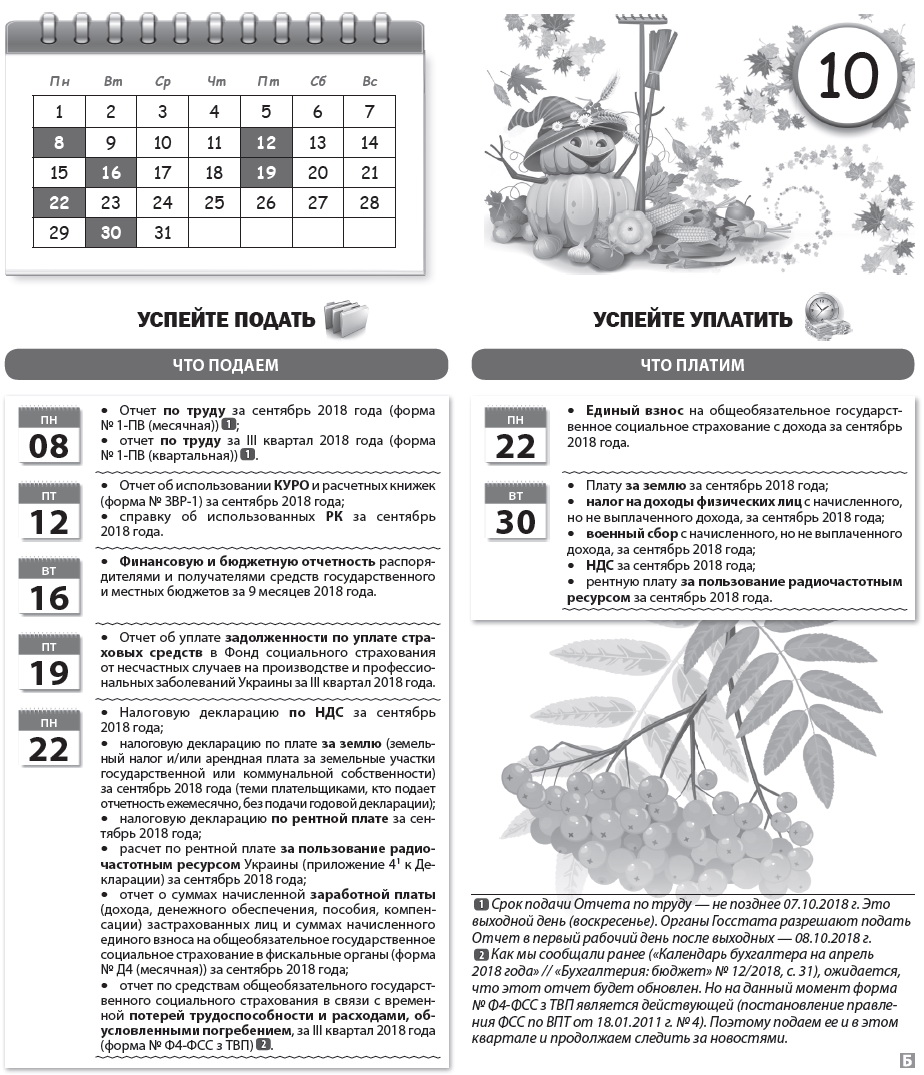 Календарь бухгалтера на октябрь 2018 года