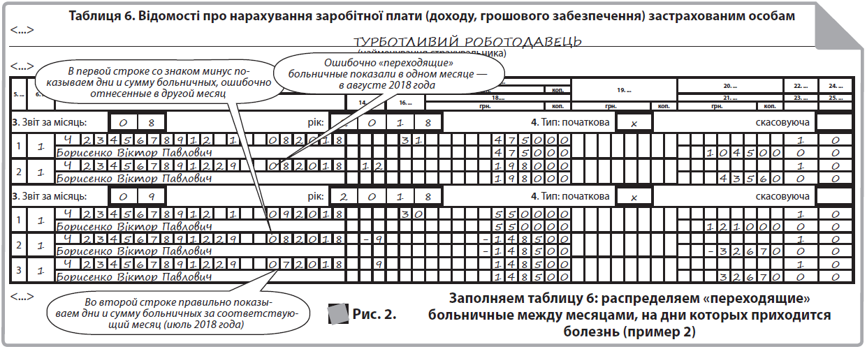 Пример 2 («переходящие» больничные в одной строке). Допустим, что в примере 1 (см. с. 29) больничные за дни болезни с 23 июля по 3 августа 2018 года отражены общей суммой 1980,00 грн (1485,00 + 495,00) за 12 к. дн. болезни в строке за август 2018 года (см. рис. 2). Исправляем в сентябре 2018 года.