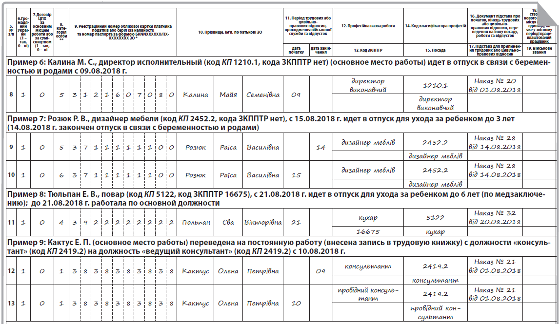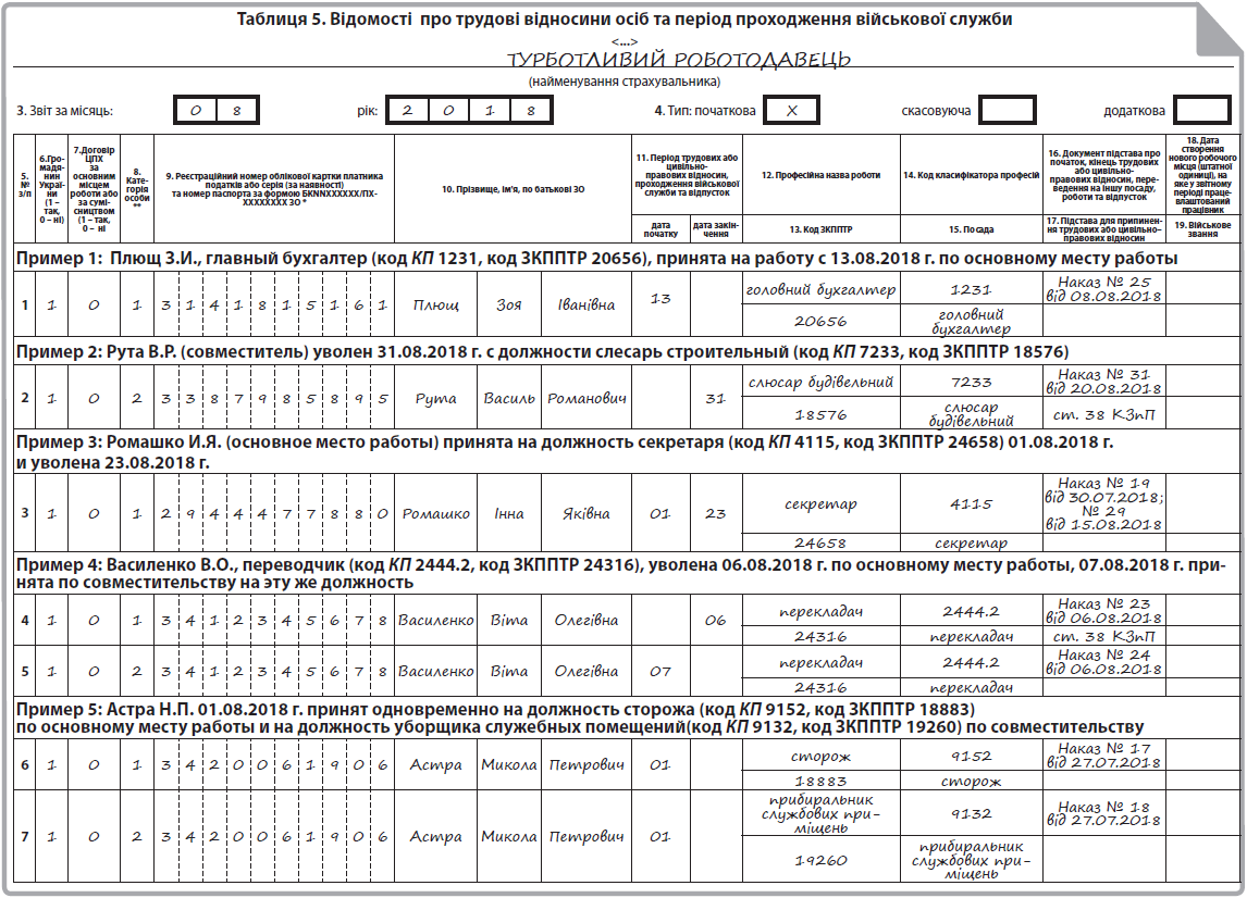 Ситуация 2 уволен, а затем снова принят на работу к этому же работодателю, необходимо заполнить две строки в таблице 5. В первой указывают дату прекращения трудовых отношений (графа «дата закінчення»), во второй — дату начала трудовых отношений (графа «дата початку») (см. пример 4 на с. 41);