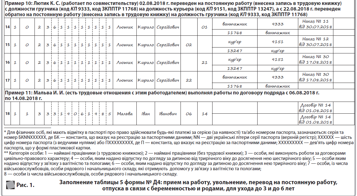 Во-первых, данные о переводе на другую должность или работу показываем в таблице 5 формы № Д4 независимо от того, требует ли такой перевод согласия работника (например, работодатель должен перевести работников, нуждающихся по состоянию здоровья в предоставлении более легкой работы, с их согласия, на такую работу в соответствии с медицинским заключением временно или без ограничения срока — ст. 170 КЗоТ) или осуществляется независимо от желания работника (например, перевод на более легкую работу беременных женщин и женщин, имеющих детей в возрасте до 3-х лет по медицинскому заключению, — ст. 178 КЗоТ).