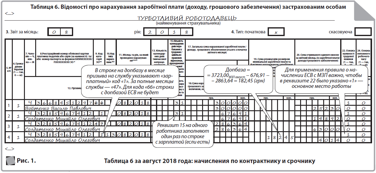 Таблицы 4 и 6 — на контрактников О суммах денежного обеспечения и пособия по беременности и родам, которое контрактники получают по месту службы, данные вносятся страхователями в таблицы 4 и 6. Такие суммы являются базой для начисления ЕСВ (22 %). Их приводят в таблицах 4 (общая сумма; аналог таблицы 1 для обычных работников) и 6 (персонифицированные данные).