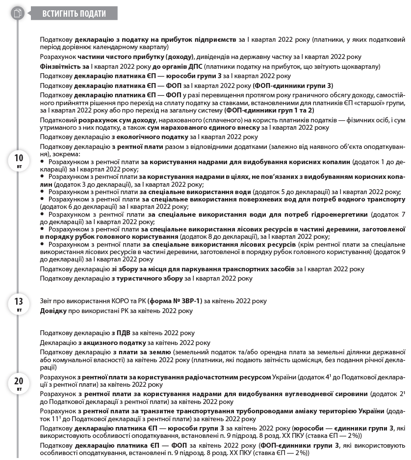 Календар бухгалтера та ФОП на травень 2022 року  ВАЖЛИВО! На період дії воєнного стану п. 6 ст. 6 Закону України «Про організацію трудових відносин в умовах воєнного стану» від 15.03.2022 р. № 2136-ІХ призупинено дію ст. 71–73 КЗпП щодо визначення святкових та вихідних днів і організації роботи в такі дні. А це означає, що «святкових» перенесень у травні 2022 року не буде, тобто 02.05.2022 р. та 09.05.2022 р. є звичайними робочими днями. У зв’язку з цим, на нашу думку, граничні терміни подання звітності та/або сплати податків, які припадали на ці дні, також не переносяться. Водночас відповідно до п. 69.1 підрозд. 10 розд. ХХ ПКУ в період дії правового режиму воєнного стану до платників податків не застосовується відповідальність за неподання або несвоєчасне подання звітності, а також несвоєчасну сплату податків, зборів, обов’язкових платежів, за умови подання звітності та сплати податків протягом шести місяців після припинення або скасування воєнного стану в Україні.  Фінзвітність за І квартал 2022 року до органів статистики  1  1  Проміжна фінансова звітність відповідно до п. 5 Порядку подання фінансової звітності, затвердженого постановою КМУ від 28.02.2000 р. № 419, має подаватися не пізніше 30.04.2022 р. Оскільки це неробочій день (субота), термін подання переноситься на перший робочий день — 02.05.2022 р., але ми радимо не залишати це на останній день.  2  Звітність має подаватися не пізніше 07.05.2022 р., але, оскільки це вихідний день (субота), органи Держстату дозволяють подавати звітність на наступний за вихідними робочий день.  Звіт про товарооборот торгової мережі (форма № 1-торг (місячна)) за квітень 2022 року  Звіт з праці (форма № 1-ПВ (місячна))  2  за квітень 2022 року  Звіт про заборгованість з оплати праці (форма № 3-борг (місячна))  2  за квітень 2022 року  Звіт про обсяг оптового товарообороту (форма № 1-опт (місячна)) за квітень 2022 року  Звіт про обсяги виробництва та реалізації спирту (форма № 1-РС) за квітень 2022 року  Звіт про обсяги виробництва та реалізації алкогольних напоїв (форма № 2-РС) за квітень 2022 року  Звіт про обсяги виробництва та реалізації тютюнових виробів (форма № 3-РС) за квітень 2022 року  Звіт про обсяги придбання та реалізації алкогольних напоїв у оптовій мережі (форма № 1-ОА) за квітень 2022 року  Звіт про обсяги придбання та реалізації тютюнових виробів у оптовій мережі (форма № 1-ОТ) за квітень 2022 року  Податкову декларацію з податку на прибуток підприємств за І квартал 2022 року (платники, у яких податковий період дорівнює календарному кварталу)  Розрахунок частини чистого прибутку (доходу), дивідендів на державну частку за І квартал 2022 року  Фінзвітність за І квартал 2022 року до органів ДПС (платники податку на прибуток, що звітують щокварталу)  Податкову декларацію платника ЄП — юрособи групи 3 за І квартал 2022 року  Податкову декларацію платника ЄП — ФОП за І квартал 2022 року (ФОП-єдинники групи 3)  Податкову декларацію платника ЄП — ФОП у разі перевищення протягом року граничного обсягу доходу, самостійного прийняття рішення про перехід на сплату податку за ставками, встановленими для платників ЄП «старшої» групи, за I квартал 2022 року або про перехід на загальну систему (ФОП-єдинники груп 1 та 2)  Податковий розрахунок сум доходу, нарахованого (сплаченого) на користь платників податків — фізичних осіб, і сум утриманого з них податку, а також сум нарахованого єдиного внеску за 