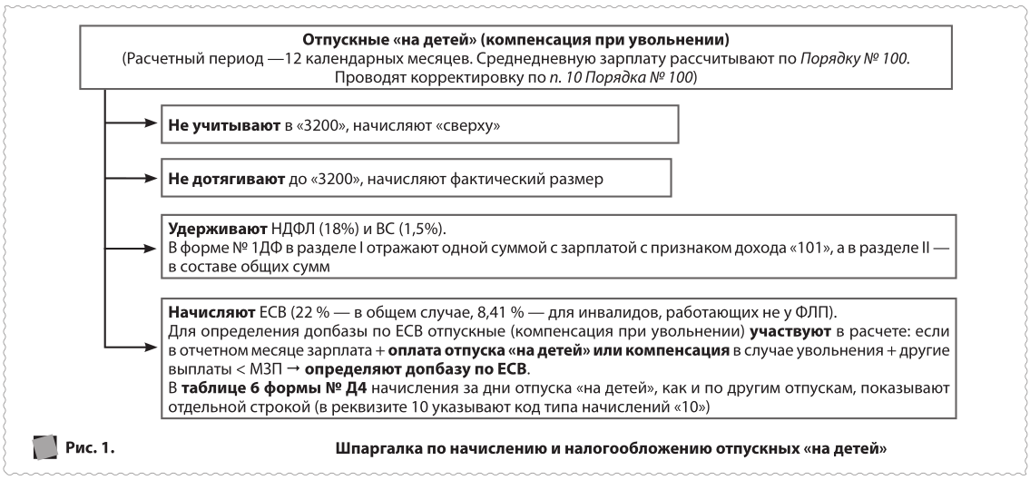 Отпуск «на детей» — это оплачиваемый отпуск. На рис. 1 (с. 44) приведена шпаргалка по начислению и налогообложению такой выплаты. Учтите, что данная выплата: