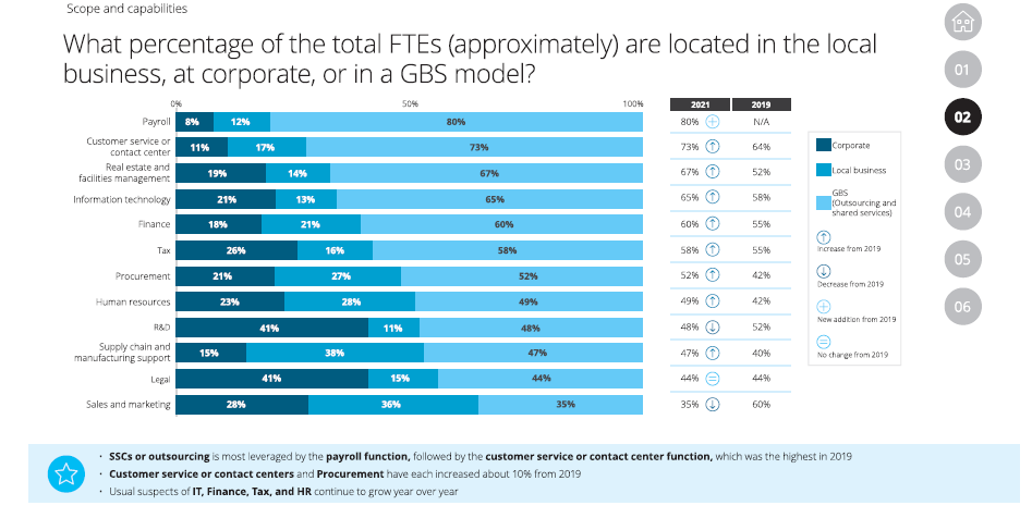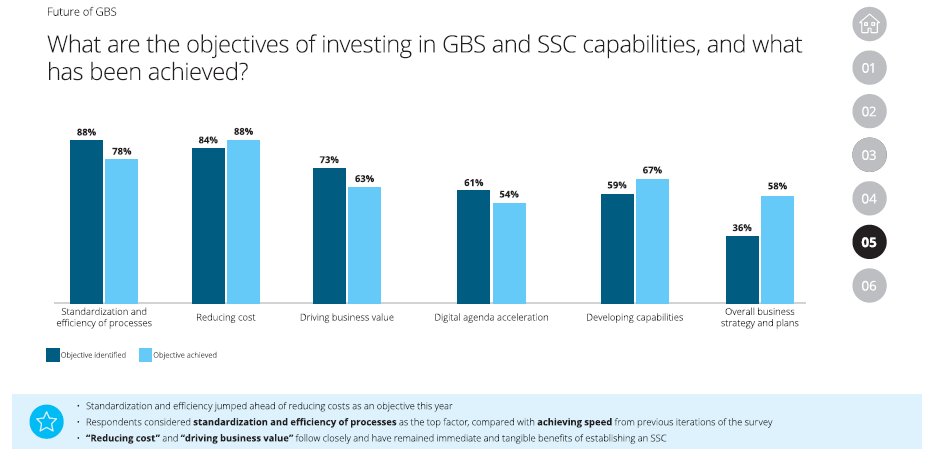 Я також хотіла би показати дані зі звіту Deloitte «2021 Global Shared Services and Outsourcing Survey Report». З першого графіка ми бачимо, що значна частка працівників працює в GBS і що є позитивний тренд на перенесення більшої кількості обов’язків до GBS. А другий слайд ілюструє, чи була досягнута мета інвестування в GBS та SSC. Отже, можна зробити висновок, що відкриття таких центрів вигідне для корпорацій і ті продовжують інвестувати в подальший розвиток.