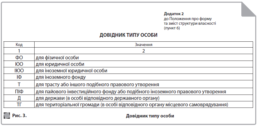 До речі, окрім структури власності Положенням № 161 затверджено також ДОВІДНИК ТИПУ ОСОБИ (додаток 2 до Положення № 161 — див. рис. 3), згідно з яким слід заповнювати графу 1 — тип особи (наприклад, ФО — фізособа; ЮО — юрособи; ІЮО — іноземна юрособа) та ДОВІДНИК характеру значного або вирішального впливу на керівництво чи діяльність юридичної особи нeзaлeжнo від формального володіння (додаток 3 до Положення № 161), згідно з яким слід заповнити графу 17 (див. рис. 4).