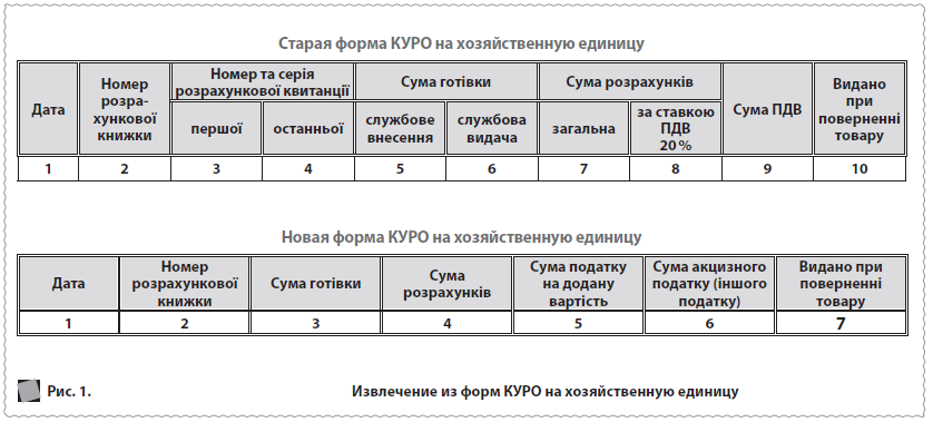 КУРО на хозединицу состоит из одного раздела «Облік розрахункових квитанцій та руху готівки». В отличие от раздела 2 КУРО на РРО, количество граф КУРО на хозединицу уменьшилось: на удивление, вместо 10 их стало 7, с учетом того, что появилась новая графа (гр. 6) — «Сума акцизного податку (іншого податку)». Из новой формы исключены только две графы, в которые требовалось вносить данные о номере и серии первой и последней расчетных квитанций. В то же время в новом Порядке все равно есть требование осуществлять записи о реквизитах расчетных квитанций до начала использования РК и непосредственно после окончания ее использования в пределах рабочего дня или смены (п. 5 гл. 4 разд. II Порядка по РК и КУРО). Хотя обязательно ли выполнять его без специальных граф? Остается ждать соответствующих разъяснений контролирующих органов.
