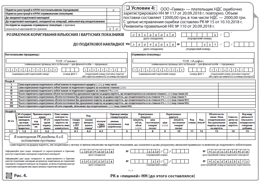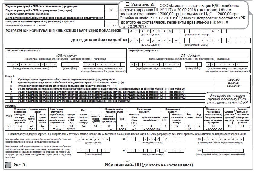 Их теперь регламентируют пп. 22–24 Порядка заполнения налоговой накладной, утвержденного приказом МФУ от 31.12.2015 г. № 1307 (далее — Порядок № 1307). Заметим: отдельные правила уже действовали и до обновления Порядка № 1307. Их фискалы «регламентировали» в своих разъяснениях в ЗІР и ИНК. Однако не обошлось и без новинок. Так, РК к «лишним» НН придется составлять в особом порядке. Кроме того, в материале, который вы можете прочесть на с. 7, налоговики дали дополнительные разъяснения по поводу заполнения РК к НН, которые составлены до 01.12.2018 г.
