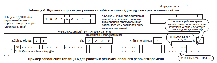 Пример. Работника (основной работник, не является госслужащим, не является инвалидом) с 20 мая 2015 года по его желанию в соответствии со ст. 56 КЗоТ перевели на неполное рабочее время — 4 часа в день. Оклад работника составляет 4000,00 грн. Зарплата до перевода составила 2222,00 грн, а за период работы в режиме неполного рабочего дня — 889,00 грн. Всего за май 2015 года начислена зарплата в сумме 3111,00 грн. С этой суммы удержан ЕСВ по ставке 3,6 % — 112,00 грн, и начислен «сверху» по ставке 37 % — 1151,07 грн.