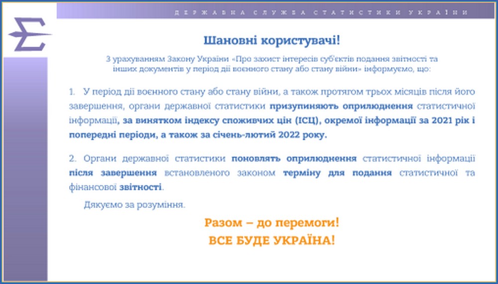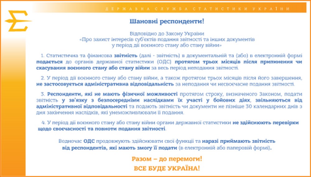 Щодо подання статистичної звітності та оприлюднення статистичної інформації Держстатом під час воєнного стану