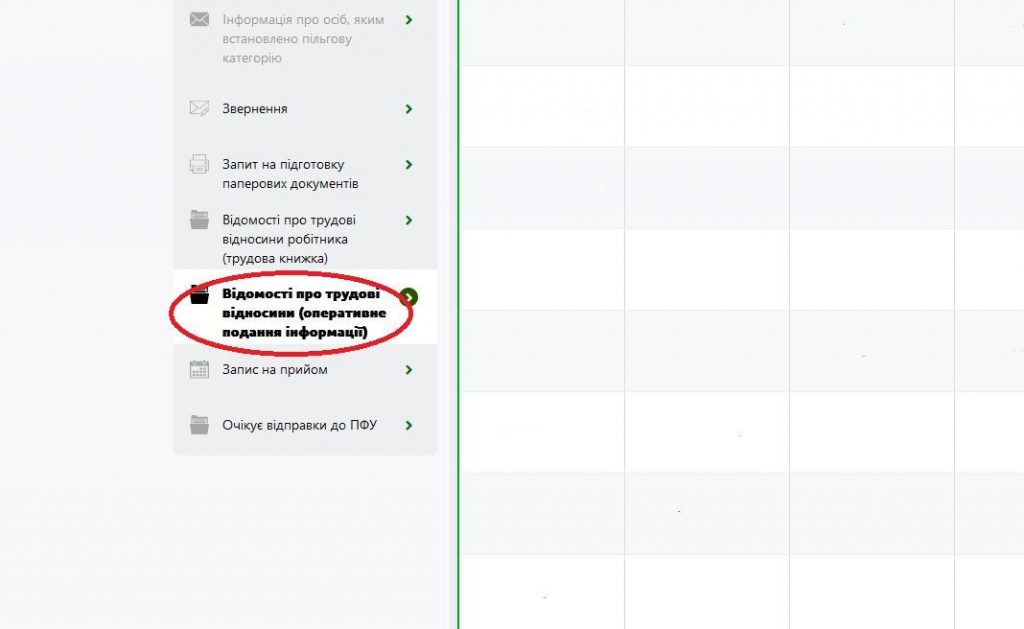 2. В особистому кабінеті страхувальника (в меню зліва) зайдіть у розділ “Комунікації з ПФУ” та оберіть опцію “Відомості про трудові відносини (оперативне подання інформації)”.