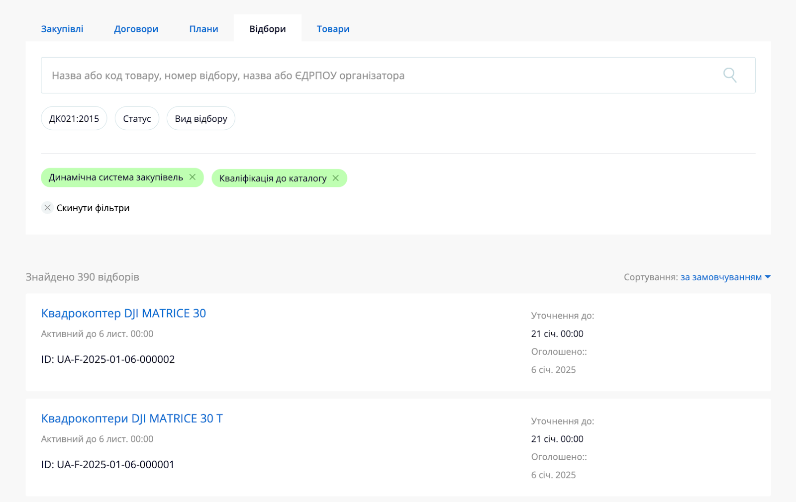 Вкладка “Відбори” містить перелік всіх кваліфікаційних відборів учасників (до каталогу чи динамічної системи закупівель). Для кожного з відборів передбачено окрему сторінку, де можна ознайомитися з детальною інформацією: умовами участі, поданими заявками та прийнятими рішеннями.
