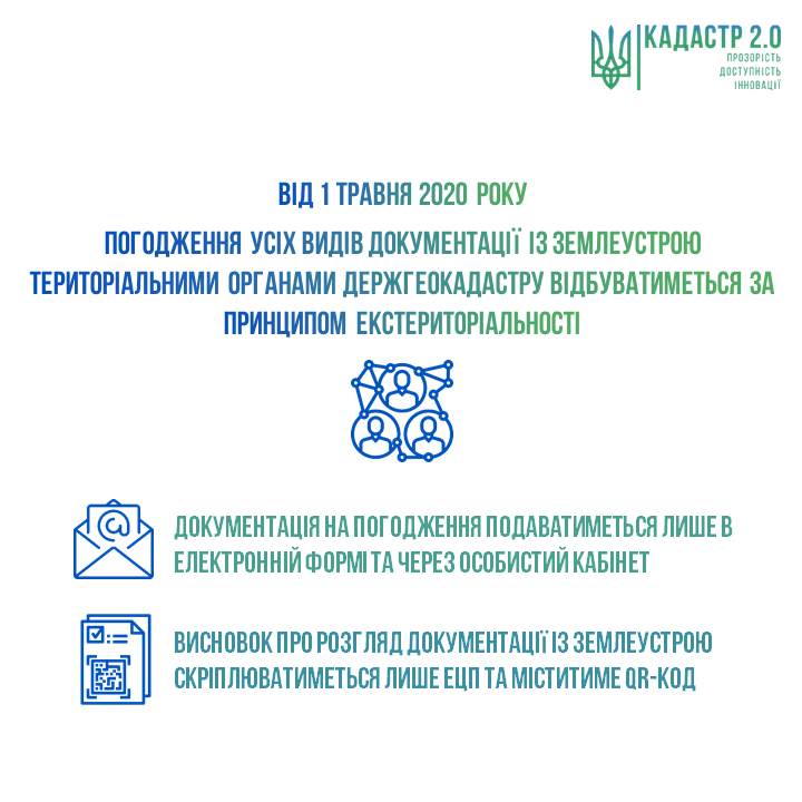 1 травня 2020 року набула чинності Постанова Кабінету Міністрів України від 3 березня 2020 р. № 208 «Про внесення змін до постанови Кабінету Міністрів України від 31 серпня 2016 р. № 580», яка передбачає погодження усіх видів документації із землеустрою територіальними органами Держгеокадастру за принципом екстериторіальності. Завдяки цьому буде знижено прояви корупційних ризиків та забезпечено прозорість дій під час погодження такої документації.