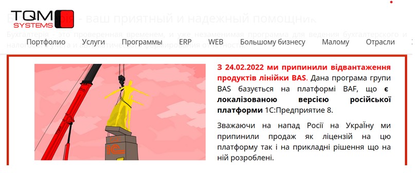 Так на сайті TQM Systems, одного з постачальників вищеперерахованих продуктів, досі міститься розділ «1С:Підприємство», однак натомість клієнтам упродовж 2021 року пропонували придбати ліцензію на «BAS» через те, що «з 01.01.2021 програма „1С:Підприємство Бухгалтерія“ знята з продажу». І тільки минулого місяця з’явилося повідомлення, з відсилом на дату початку війни в Україні, про відмову від російських програм. Що це, чергове «перефарбування» чи нарешті прояв української свідомості? Дуже сподіваємося, що останнє.