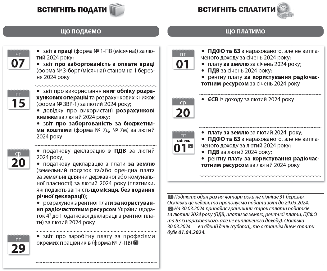 2. В календарі наведено основні форми статистичної звітності. Повний перелік форм державних статистичних спостережень на 2024 рік2, а також терміни подання форм статистичної та фінансової звітності3 наведено на офіційній вебсторінці Державної служби статистики України. Крім цього, установа може отримати перелік статистичних форм за кодом ЄДРПОУ за посиланням: https://ess.ukrstat.gov.ua/. Також нагадуємо, що з 01.01.2023 набрав чинності Закон України «Про офіційну статистику» від 16.08.2023 № 2524-IX, ч. 4 ст. 10 якого передбачає, що респонденти подають статистичну звітність та фінансову звітність виробникам офіційної статистики виключно в електронній формі. Безкоштовний сервіс для електронного звітування за статистичними звітами «Кабінет респондента» можна знайти за посиланням: https://statzvit.ukrstat.gov.ua.
