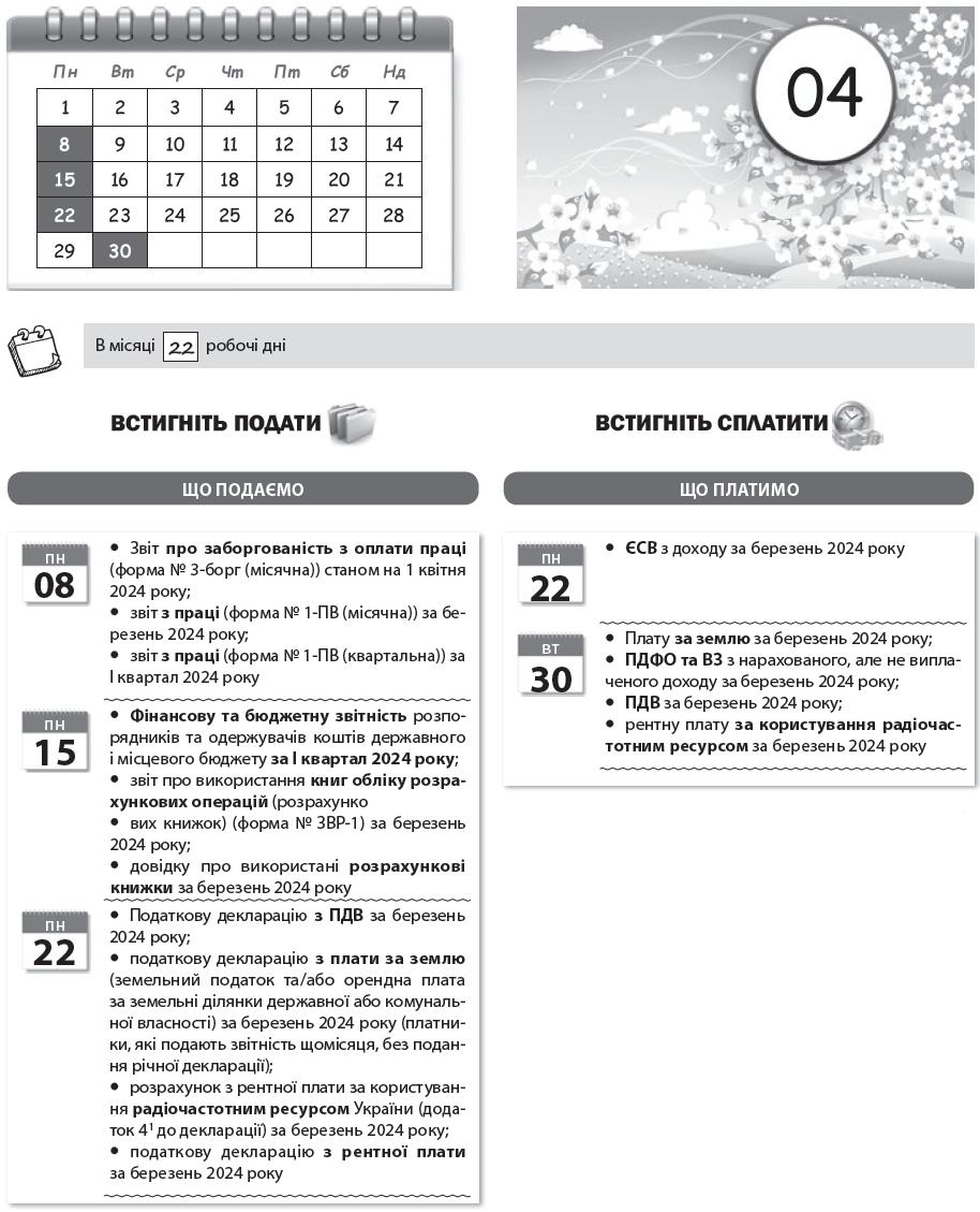 Зверніть увагу: термін подання звітів з праці — не пізніше 07.04.2024 (неділя). Органи Держстату дозволяють подати звіт в перший робочий день після вихідних, тобто в цьому випадку — 08.04.2024 (див. газету «Зарплата та кадрова справа, № 1/2019, с. 19».
