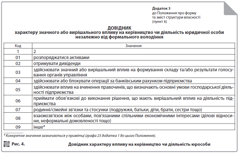 До речі, окрім структури власності Положенням № 161 затверджено також ДОВІДНИК ТИПУ ОСОБИ (додаток 2 до Положення № 161 — див. рис. 3), згідно з яким слід заповнювати графу 1 — тип особи (наприклад, ФО — фізособа; ЮО — юрособи; ІЮО — іноземна юрособа) та ДОВІДНИК характеру значного або вирішального впливу на керівництво чи діяльність юридичної особи нeзaлeжнo від формального володіння (додаток 3 до Положення № 161), згідно з яким слід заповнити графу 17 (див. рис. 4).
