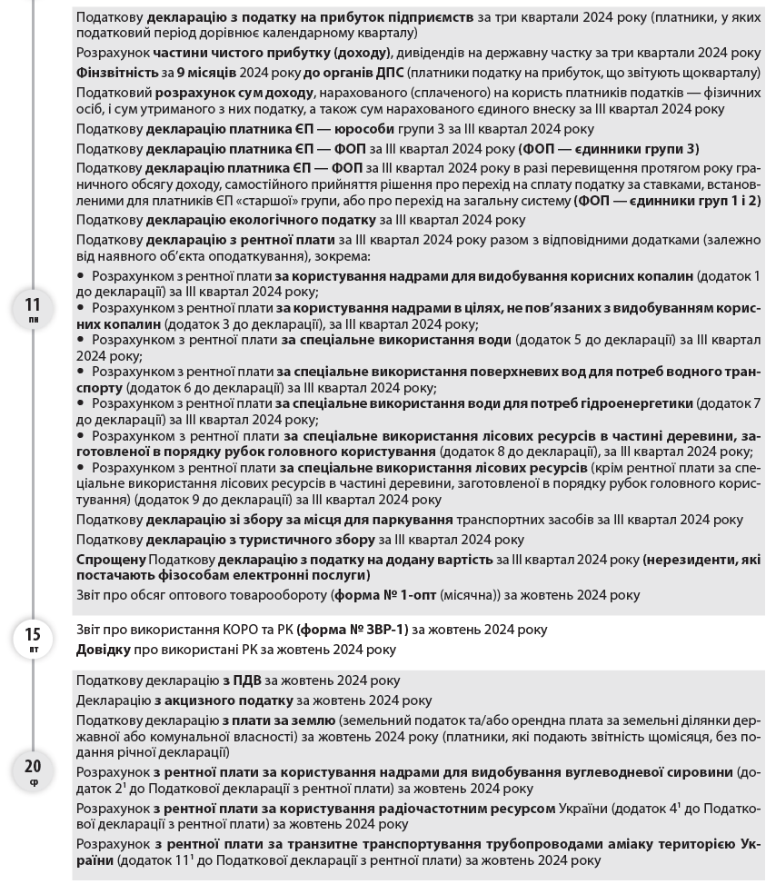 Зауважимо: на 30.11.2024 припадає граничний строк сплати податків за жовтень 2024 року (ПДВ, акцизного податку, плати за землю, рентної плати, ПДФО й ВЗ з нарахованого, але не виплаченого доходу), а також граничний строк сплати авансового внеску з туристичного збору за листопад 2024 року (для платників, які сплачують турзбір щомісяця). Водночас відповідно до п. 57.1 ПКУ, в разі якщо граничний строк сплати податків припадає на вихідний або святковий день, останнім днем сплати вважатиметься операційний (банківський) день, що настає за таким вихідним або святковим днем. Отже, оскільки 30.11.2024 є вихідним днем (субота), останнім строком сплати буде 01.12.2024.