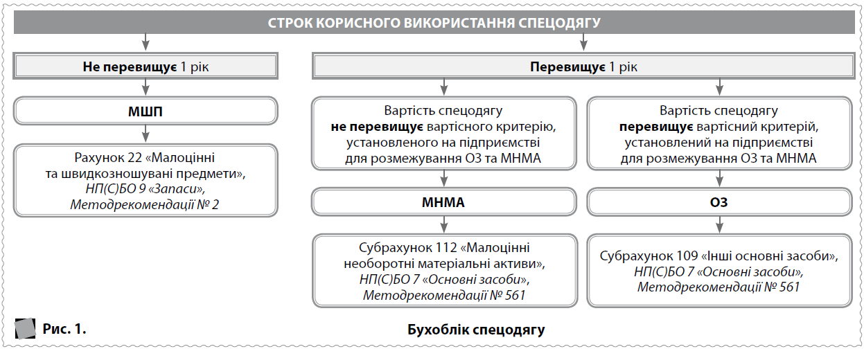 Відображення в бухобліку спецодягу залежить від строку його використання та вартості. Якщо спецодяг будуть застосовувати не більше року, то обліковувати його слід у складі МШП, а якщо понад рік — у складі необоротних активів (див. рис. 1).