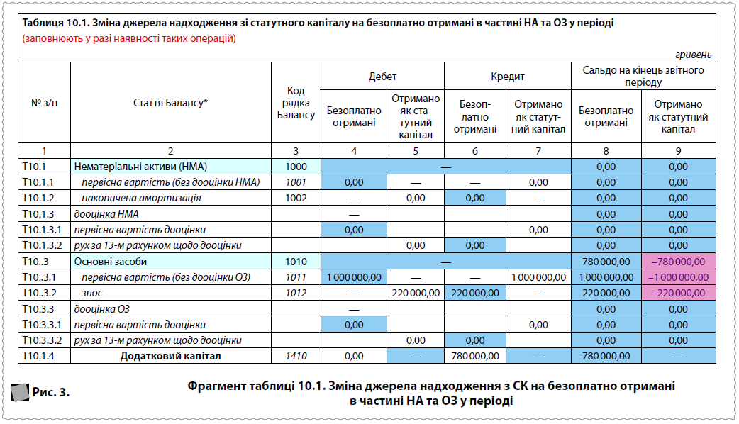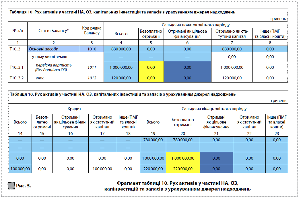 Після здійснення всіх наведених господарських операцій перевіримо правильність змін у таблиці 10 (див. рис. 5). Перевіряємо, чи відповідає сальдо на початок звітного періоду початковим умовам прикладу (первісна вартість = 1 млн грн, знос = –120 тис. грн), чи вказано в кредитовому обороті суму амортизації за поточний період (амортизація = 100 тис. грн) і чи відбулася зміна джерела надходження після заповнення таблиці 10.1 (залишкова вартість безоплатно отриманих ОЗ = 1 млн грн – 220 тис. грн = 780 тис. грн).