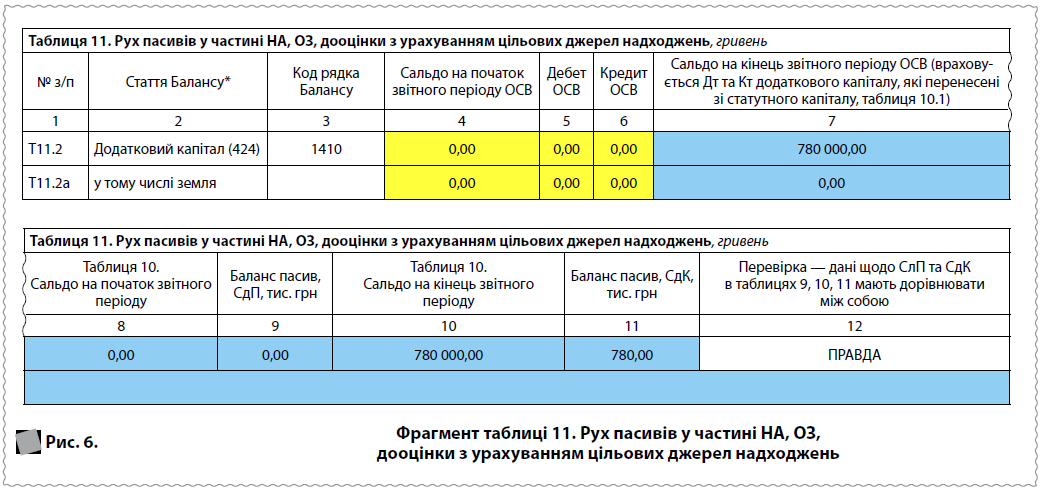 Відповідно до правильно заповненої таблиці 10 перевіряємо далі. Переходимо до таблиці 11 руху пасивів, наведеної на рис. 6. Також не забуваємо для 100 % упевненості перевіряти таблицю 14 «Ув’язка даних» щодо наявних відхилень.