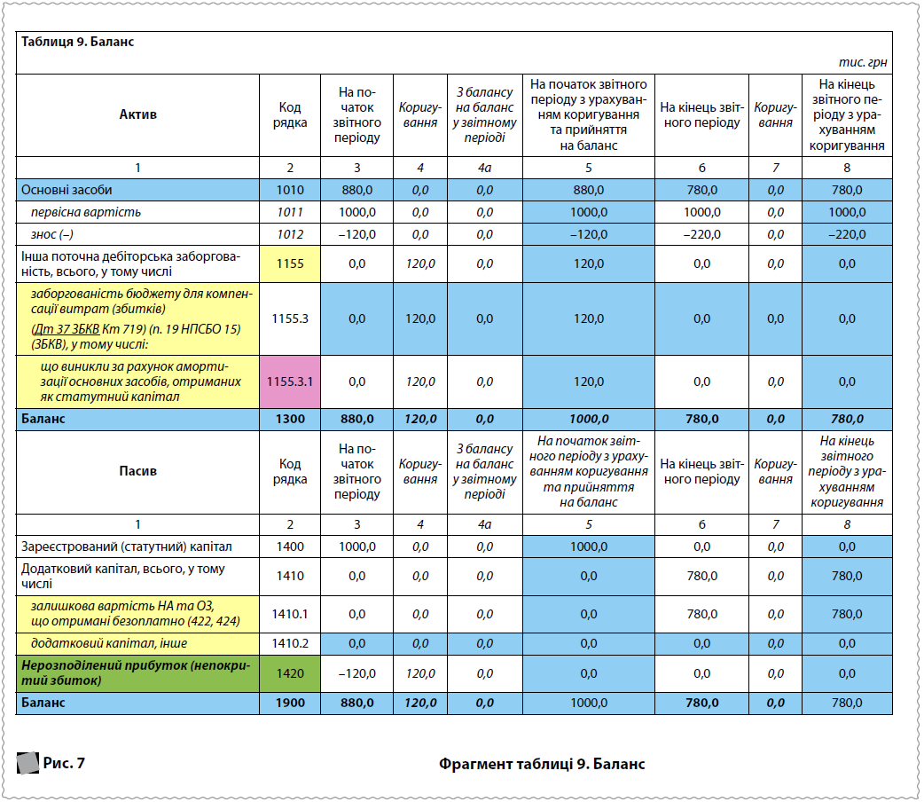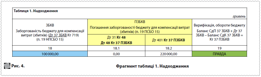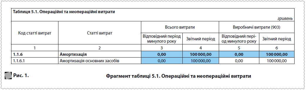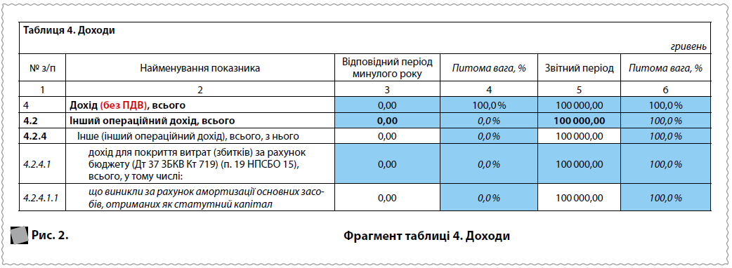 Далі на рис. 2 відображаємо нарахування доходів для покриття збитків, що виникли за рахунок амортизації ОЗ, отриманих як статутний капітал (господарська операція № 2). У цих рядках наводимо суму пропорційно нарахованої амортизації за звітний період, яка підлягає компенсації, а не загальну суму збитків.