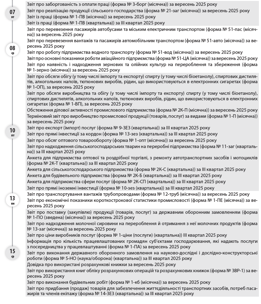 Звіт про збирання врожаю сільськогосподарських культур (форма № 37-сг (місячна)) за вересень 2025 року  Звіт про виробництво продукції тваринництва та кількість сільськогосподарських тварин (форма № 24-сг (місячна)) за вересень 2025 року  Звіт про використання та запаси палива (форма № 4-мтп (місячна)) за вересень 2025 року  Звіт про ціни виробників промислової продукції (форма № 1-ціни (пром) (місячна)) за вересень 2025 року  Звіт про товарооборот торгової мережі (форма № 1-торг (місячна)) за вересень 2025 року  Звіт про заборгованість з оплати праці (форма № 3-борг (місячна)) за вересень 2025 року  Звіт про реалізацію продукції сільського господарства (форма № 21-заг (місячна)) за вересень 2025 року  Звіт із праці (форма № 1-ПВ (місячна)) за вересень 2025 року  Звіт із праці (форма № 1-ПВ (квартальна)) за ІІІ квартал 2025 року  Звіт про перевезення пасажирів автобусами та міським електричним транспортом (форма № 51-пас (місячна)) за вересень 2025 року  Звіт про перевезення вантажів та пасажирів автомобільним транспортом (форма № 51-авто (місячна)) за вересень 2025 року  Звіт про роботу підприємства водного транспорту (форма № 51-вод (місячна)) за вересень 2025 року  Звіт про основні показники роботи авіаційного підприємства (форма № 51-ЦА (місячна)) за вересень 2025 року  Звіт про наявність і надходження зернових та олійних культур на перероблення та збереження (форма № 1-зерно (місячна)) за вересень 2025 року  Звіт про обсяги обігу (у тому числі імпорту та експорту) спирту (у тому числі біоетанолу), спиртових дистилятів, алкогольних напоїв, тютюнових виробів, рідин, що використовуються в електронних сигаретах (форма № 1-ОП), за вересень 2025 року  Звіт про обсяги виробництва та обігу (у тому числі імпорту та експорту) спирту (у тому числі біоетанолу), спиртових дистилятів, алкогольних напоїв, тютюнових виробів, рідин, що використовуються в електронних сигаретах (форма № 1-ВП), за вересень 2025 року  Обстеження ділової активності промислового підприємства (форма № 2К-П (місячна)) за вересень 2025 року  Терміновий звіт про виробництво промислової продукції (товарів, послуг) за видами (форма № 1-П (місячна)) за вересень 2025 року  Звіт про експорт (імпорт) послуг (форма № 9-ЗЕЗ (квартальна)) за ІІІ квартал 2025 року  Звіт про прямі інвестиції за кордон (форма № 13-зез (квартальна)) за ІІІ квартал 2025 року  Звіт про обсяг оптового товарообороту (форма № 1-опт (місячна)) за вересень 2025 року  Звіт про надходження сільськогосподарських тварин на переробні підприємства (форма № 11-заг (квартальна)) за ІІІ квартал 2025 року  Анкета для підприємства оптової та роздрібної торгівлі, з ремонту автотранспортних засобів і мотоциклів (форма № 2К-Т (квартальна)) за ІІІ квартал 2025 року  Анкета для сільськогосподарського підприємства (форма № 2К-С (квартальна)) за ІІІ квартал 2025 року  Анкета для будівельного підприємства (форма № 2К-Б (квартальна)) за ІІІ квартал 2025 року  Анкета для підприємства сфери послуг (форма № 2К-СП (квартальна)) за ІІІ квартал 2025 року  Звіт про прямі іноземні інвестиції (форма № 10-зез (квартальна)) за ІІІ квартал 2025 року  Звіт про транспортування вантажів трубопроводами (форма № 12-труб (місячна)) за вересень 2025 року  Звіт про економічні показники короткострокової статистики промисловості (форма № 1-ПЕ (місячна)) за вересень 2025 року  Звіт про поставку (закупівлю) продукції (товарів, послуг) за державним оборонним зам