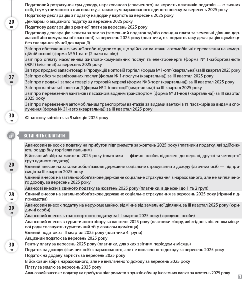 Календар бухгалтера та ФОП на жовтень 2025 року