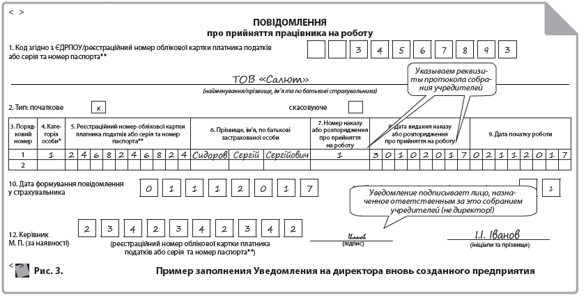 Перш ніж ми розглянемо, як це зробити, зауважимо таке. Вимога про подання Повідомлення була запроваджена у КЗпП з метою запобігання використанню праці найманих працівників без офіційного оформлення. У випадку з директором підприємства уникнути офіційного оформлення дуже складно, оскільки дані про керівника підприємства вносяться до відомостей, наявних у ЄДР (п. 13 ч. 2 ст. 9 Закону № 7553). Дані про керівника вказують у реєстраційній картці на проведення держреєстрації юридичної особи (форма 1)4. Ці відомості держреєстратор того ж дня передає ДФСУ, тобто вже на цьому етапі фіскальні органи повідомлені про прийнятого на роботу директора підприємства (ч. 2 ст. 13 Закону № 755).