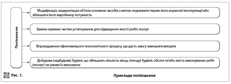 Бюджетна установа стосовно ОЗ може здійснити ремонтні роботи, спрямовані на підвищення техніко-економічних можливостей (модернізація, модифікація, добудова, дообладнання, реконструкція тощо) об’єкта, що приведе в майбутньому до збільшення економічних вигід. Такі роботи вважаються поліпшенням об’єкта ОЗ, а витрати на їх здійснення збільшують первісну вартість відповідного об’єкта. У бухобліку такі витрати відображають на субрахунку капітальних інвестицій (субрахунок 1311). Роботи з поліпшення об’єкта ОЗ здійснюють за рахунок капітальних витрат, передбачених у кошторисах на виконання зазначених робіт. Підставою для визнання таких витрат є збільшення завдяки їм очікуваного терміну корисного використання об’єкта, кількості та/або якості робіт, послуг, які надаються цим об’єктом (абз. 2 п. 3 розд. VI МР з обліку ОЗ). У пункті 3 розд. VI МР з обліку ОЗ наведено приклади поліпшення (рис. 1).