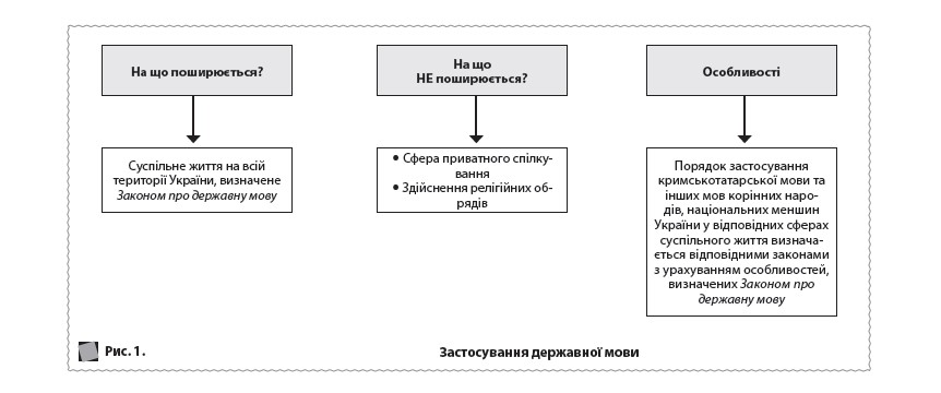 Українська мова — єдина державна мова, статус якої передбачає обов’язковість її використання на всій території України при здійсненні повноважень органами державної влади та органами місцевого самоврядування (далі — ОМС), а також в інших публічних сферах суспільного життя (ч. 7 ст. 1 Закону про державну мову). Сфери суспільного життя, на які поширює свій вплив Закон про державну мову, див. на рис. 1.