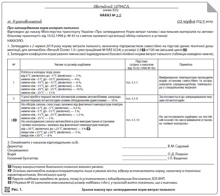 Щодо нашого «Renault Duster». Автомобіль є новим, тому якщо немає його норм у документі, ЗОЗ-КНП має звернутися із запитом до зазначеної вище установи, вказавши дані заводу-виробника, дані літературних джерел (за можливості) та дані експлуатації автомобіля, які зафіксовано під час обкатування. Отримавши відповідь від ДП «ДержавтотрансНДІпроект», наказом установлюють тимчасову індивідуальну базову лінійну норму витрат пального. До моменту, поки ДП «ДержавтотрансНДІпроект» надасть цю норму, найкраще орієнтуватися на технічні показники, зазначені в документах заводу-виробника, і не перевищувати вказаних норм. І, звичайно, врахувати всі коефіцієнти! Адже маємо справу з новенькою автівкою, а це вже п.п. 3.1.9 Норм № 43, тобто до 10 % підвищення норми. Окрім того, враховуємо інші умови експлуатації, які було зазначено вище. Такі тимчасові норми також найкраще оформити наказом, адже має бути підстава для розрахунків та обґрунтування для перевіряльників.