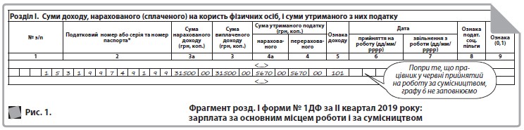 У розд. I форми № 1ДФ загальну суму зарплати, нарахованої за основним місцем роботи і за сумісництвом, відображайте в одному рядку з ознакою доходу «101». У розділі II форми № 1ДФ зарплату та утриманий ВЗ відображають у складі загальних сум.