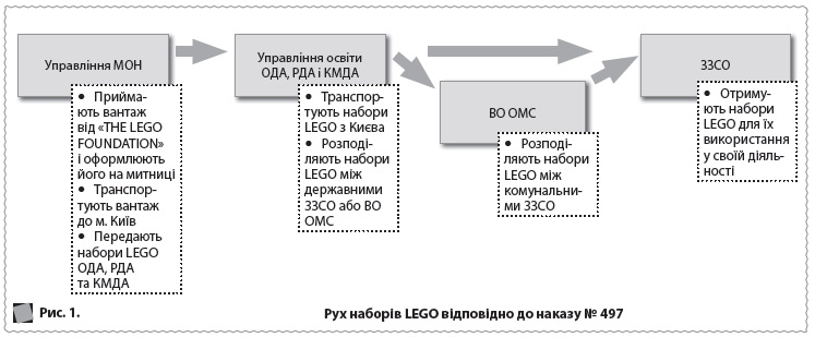 ЗВЕРНІТЬ УВАГУ! МОН частково делегувало свої зобов’язання щодо розподілу в областях гуманітарної допомоги Київській, обласним і районним держадміністраціям (п. 5 наказу № 497). Крім того, для передачі гуманітарної допомоги ЗЗСО, які підпорядковуються органам місцевого самоврядування, залучено ще одну проміжну ланку — відділ освіти органу місцевого самоврядування (далі — ВО ОМС). Тобто набори LEGO передаватимуть за схемою: МОН ► ОДА/РДА ► (ВО ОМС) ► ЗЗСО (див. рис. 1).