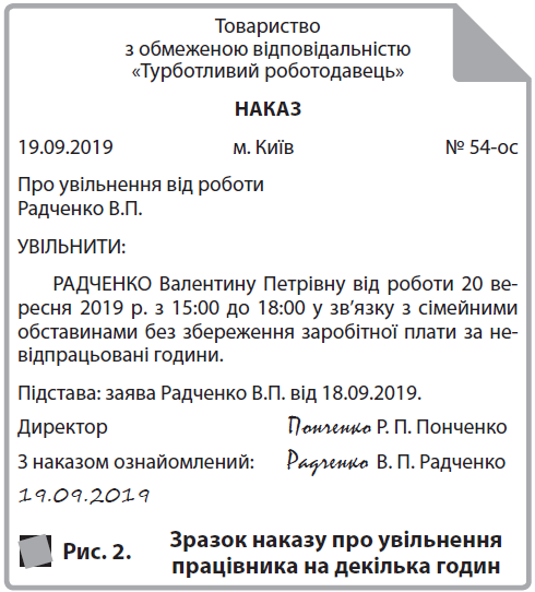 Якщо керівник згоден відпустити працівника, то на підставі заяви працівника видається наказ керівника про увільнення працівника на декілька годин (з точним зазначенням періоду часу відсутності на робочому місці).